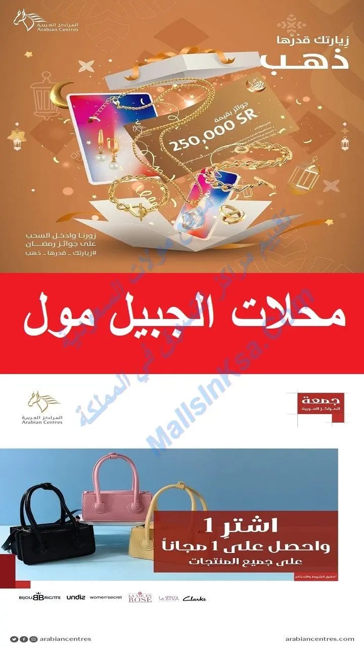 الجبيل مول روعة نقلة نوعية للجبيل البلد. مول عائلي جداً يتوفر به جميع متطلبات الأسرة. يعتبر هذا المول الآن قلب الجبيل النابض بالحياة. مول جميل تجد فيه ملابس وذهب وساعات وشنط وأحذية ومكياج وأغراض المنزل. كما تجد فيه منطقة طعام تضم مطاعم ومقاهي وسوبر ماركت مميز. أما للترفيه تجد ألعاب أطفال وملاهي وسينما رائعة.